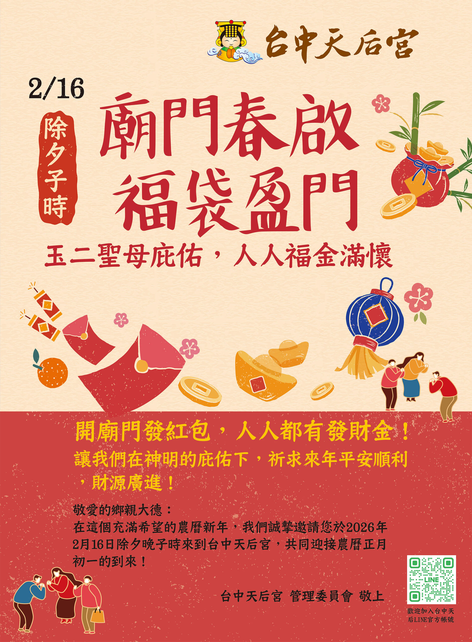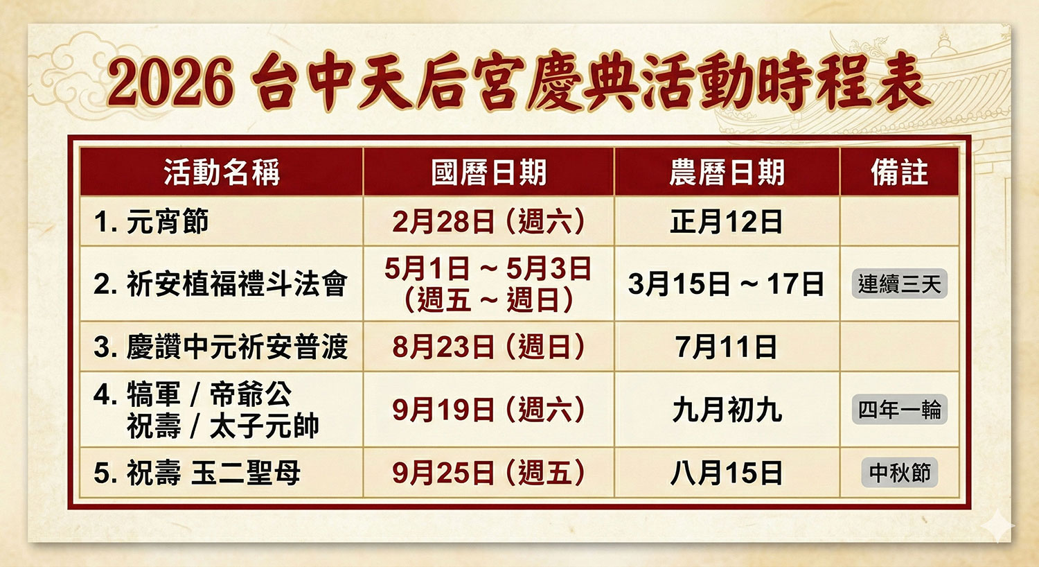 最新消息 News All 拜拜知識 訊息公告 2/16廟門春啟、福袋盈門 115年台中天后宮活動日程 七星平安橋的文化意義 七星平安橋在元宵節期間,不僅是一座橋,更是一個結合 ... 農曆三月十四日至十六日舉行祈安植福禮斗法會 本宮謹定於一一四年農曆三月十四日至十六日 (國曆4 ... 114年台中天后宮農民曆已上線 114年台中天后宮農民曆已經更新開放信眾線上下載, ... 【重要公告:參香路線變更提醒 親愛的信眾朋友們: 由於本地區正在進行區段徵收工程 ...